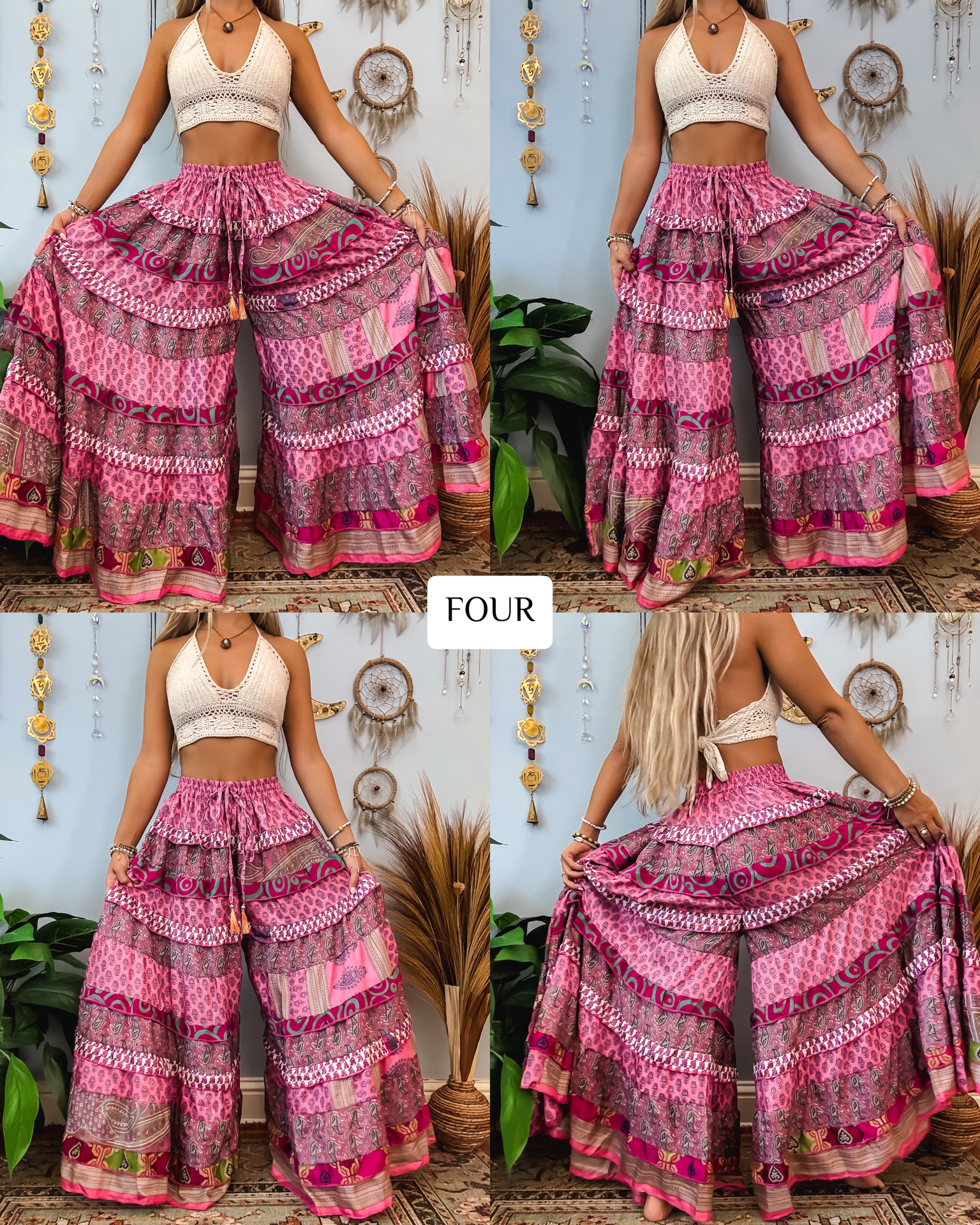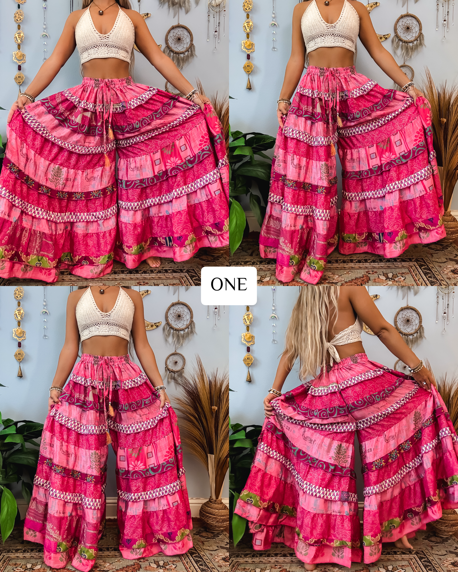 ✺ The ORIGINALLY designed and exclusive one of a kind Luna Tiered Pants by Ordinary Selenophile are handmade from recycled sari and silk scrap pieces, left over from other projects, that are stored for many months to handcraft each and every pair you see to prevent waste! Ordinary Selenophile works directly one on one with the team to create this original design by incorporating originality, creativity, economical sustainability and love into each pair you see today! As this garment is one of a kind, the pair you receive will be unique to you and only you as no two will ever be identical.