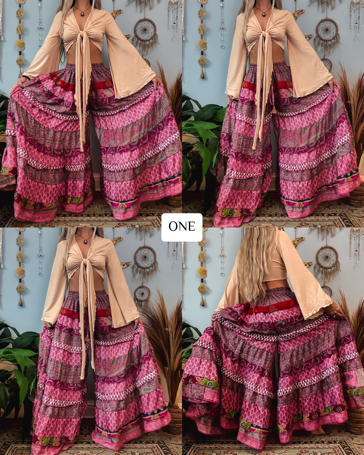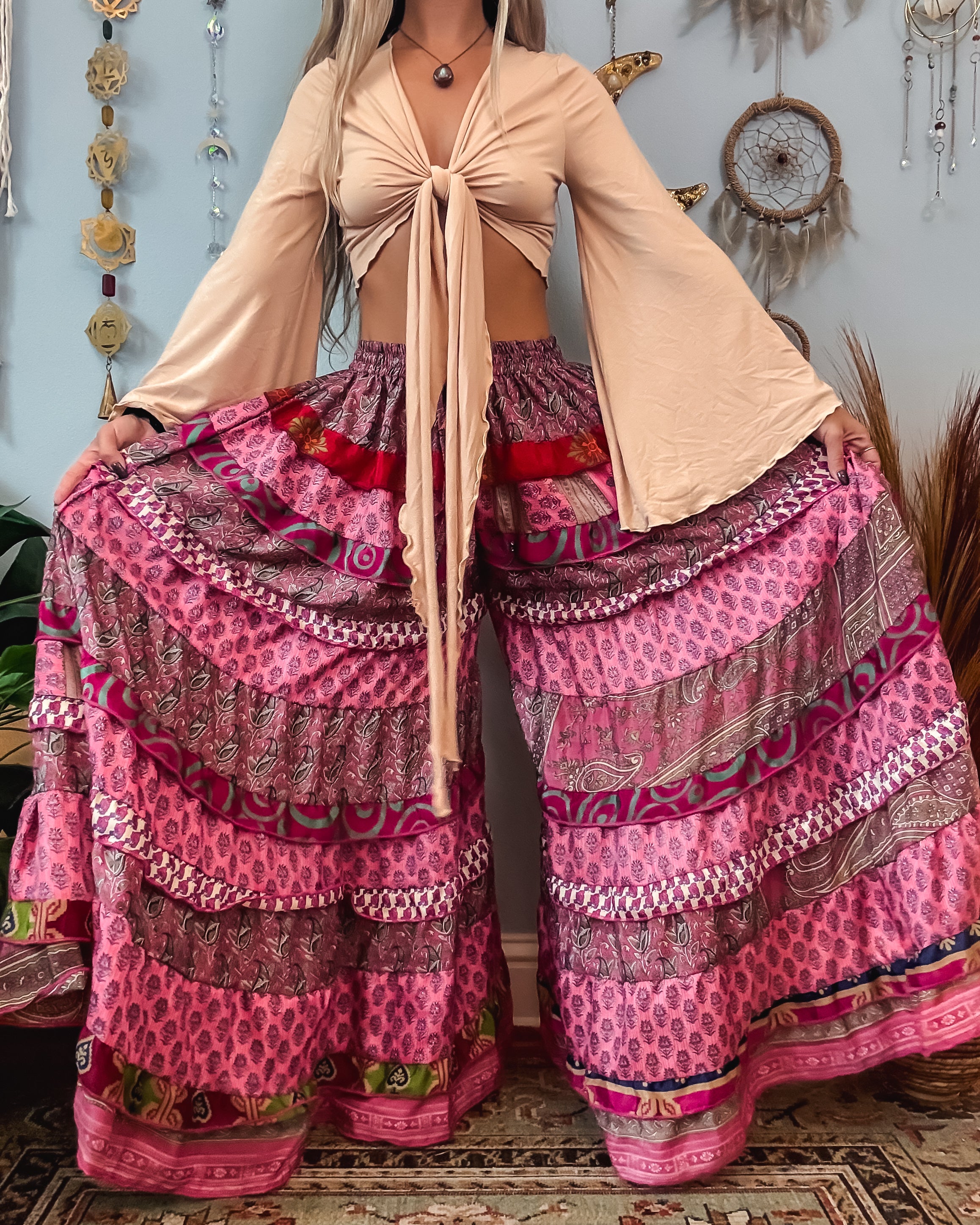 ✺ The ORIGINALLY designed and exclusive one of a kind Luna Tiered Pants by Ordinary Selenophile are handmade from recycled sari and silk scrap pieces, left over from other projects, that are stored for many months to handcraft each and every pair you see to prevent waste! Ordinary Selenophile works directly one on one with the team to create this original design by incorporating originality, creativity, economical sustainability and love into each pair you see today! As this garment is one of a kind, the pair you receive will be unique to you and only you as no two will ever be identical.