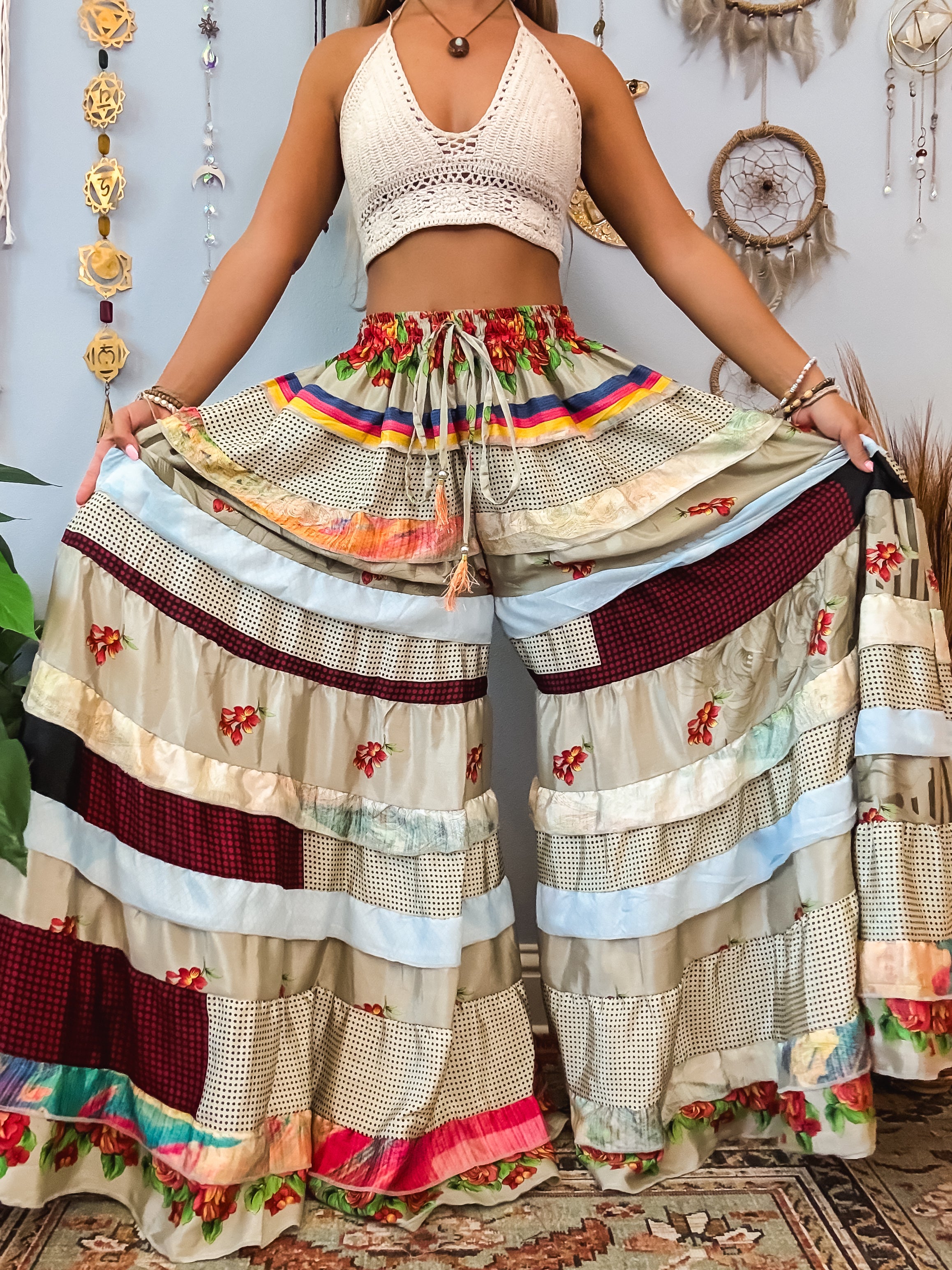 ✺ The ORIGINALLY designed and exclusive one of a kind Luna Tiered Pants by Ordinary Selenophile are handmade from recycled sari and silk scrap pieces, left over from other projects, that are stored for many months to handcraft each and every pair you see to prevent waste! Ordinary Selenophile works directly one on one with the team to create this original design by incorporating originality, creativity, economical sustainability and love into each pair you see today! As this garment is one of a kind, the pair you receive will be unique to you and only you as no two will ever be identical.