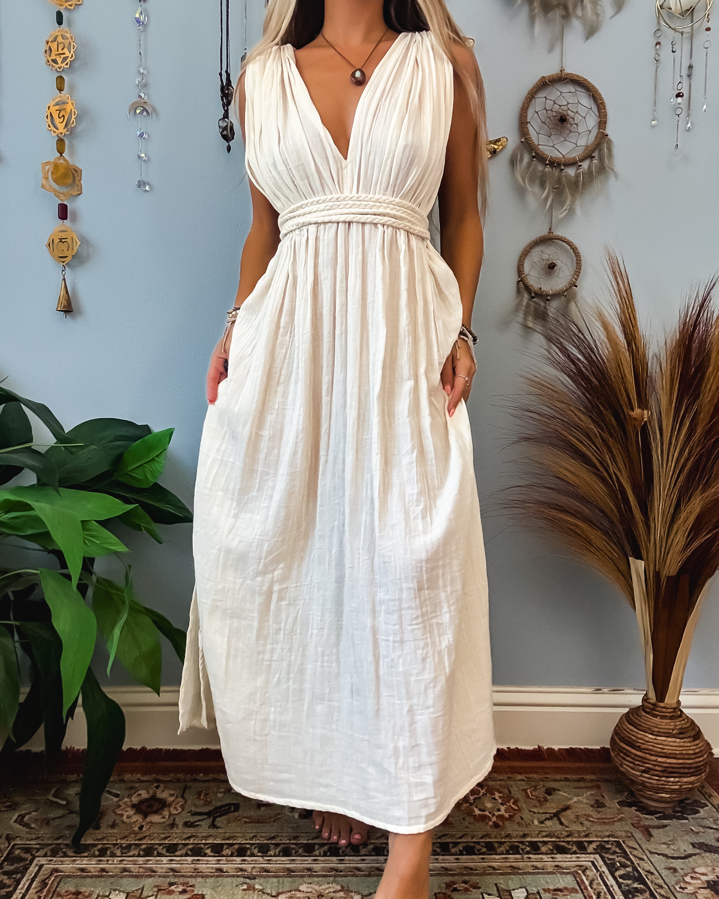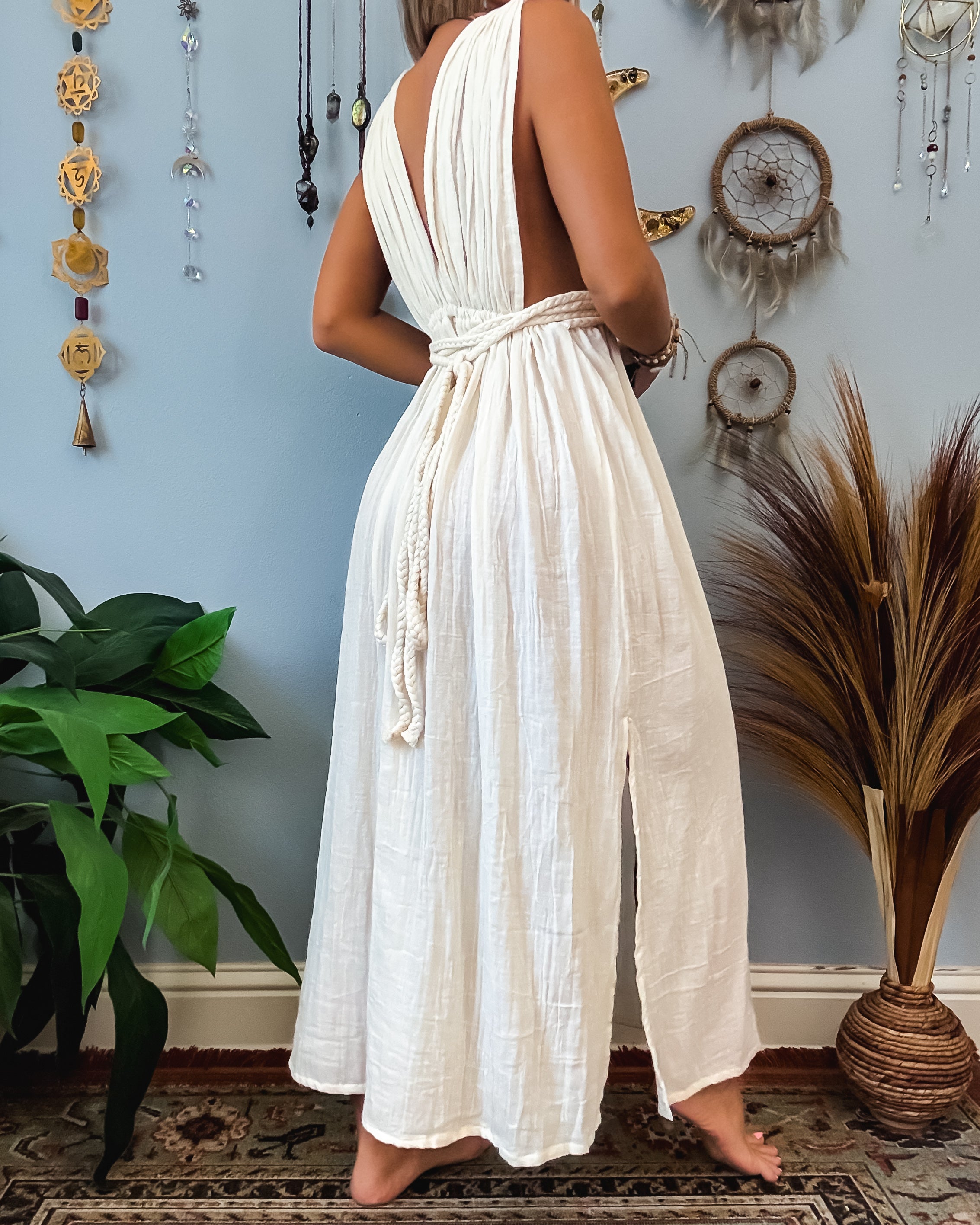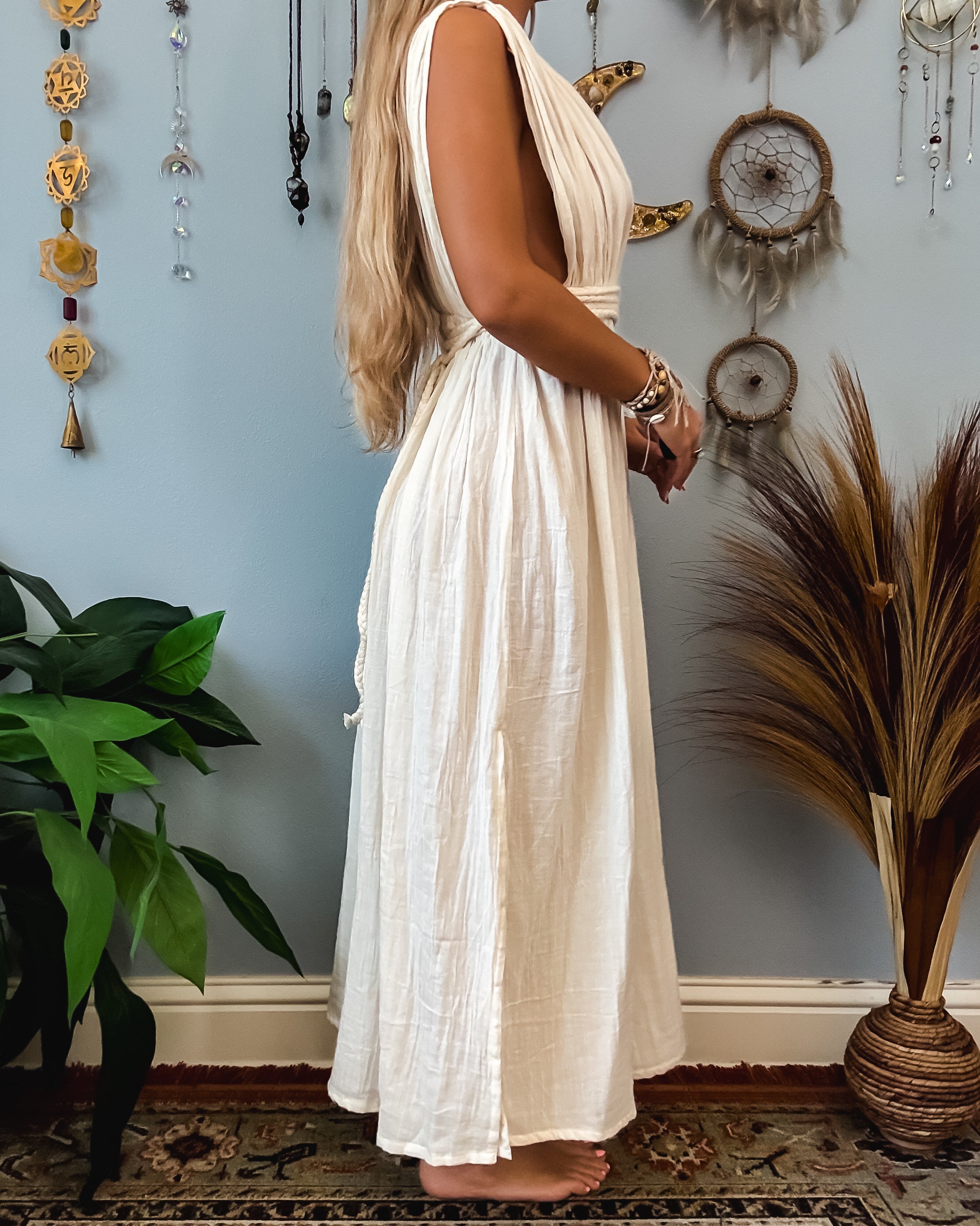 ✺ The braided rope detailing is extra long as it is meant to be styled whichever way your creative mind comes up with. The sleeves over the shoulders are attached to dress. Please adjust by pulling the dress from the front or backside to make straps for tighter for less side viewing of the chest.