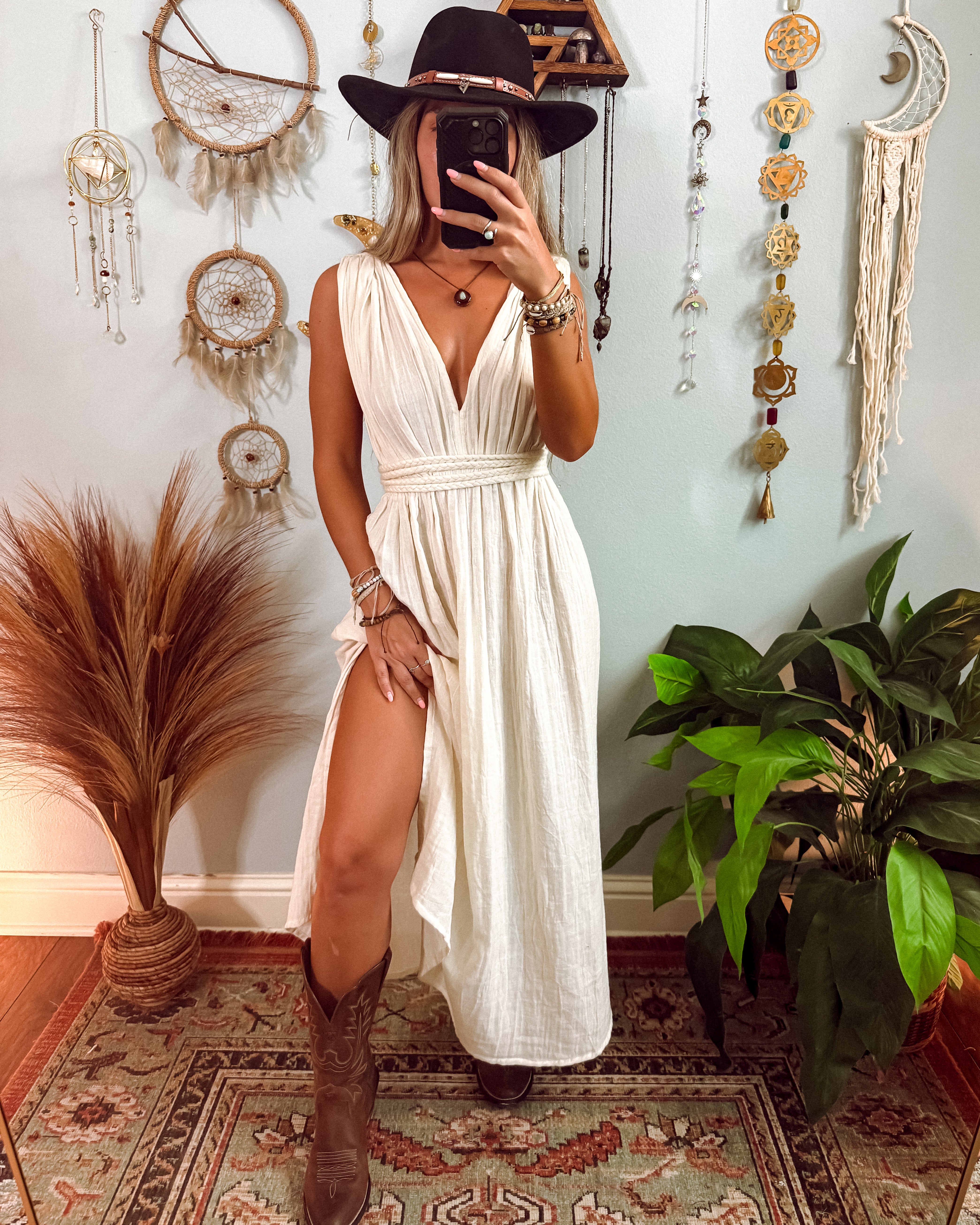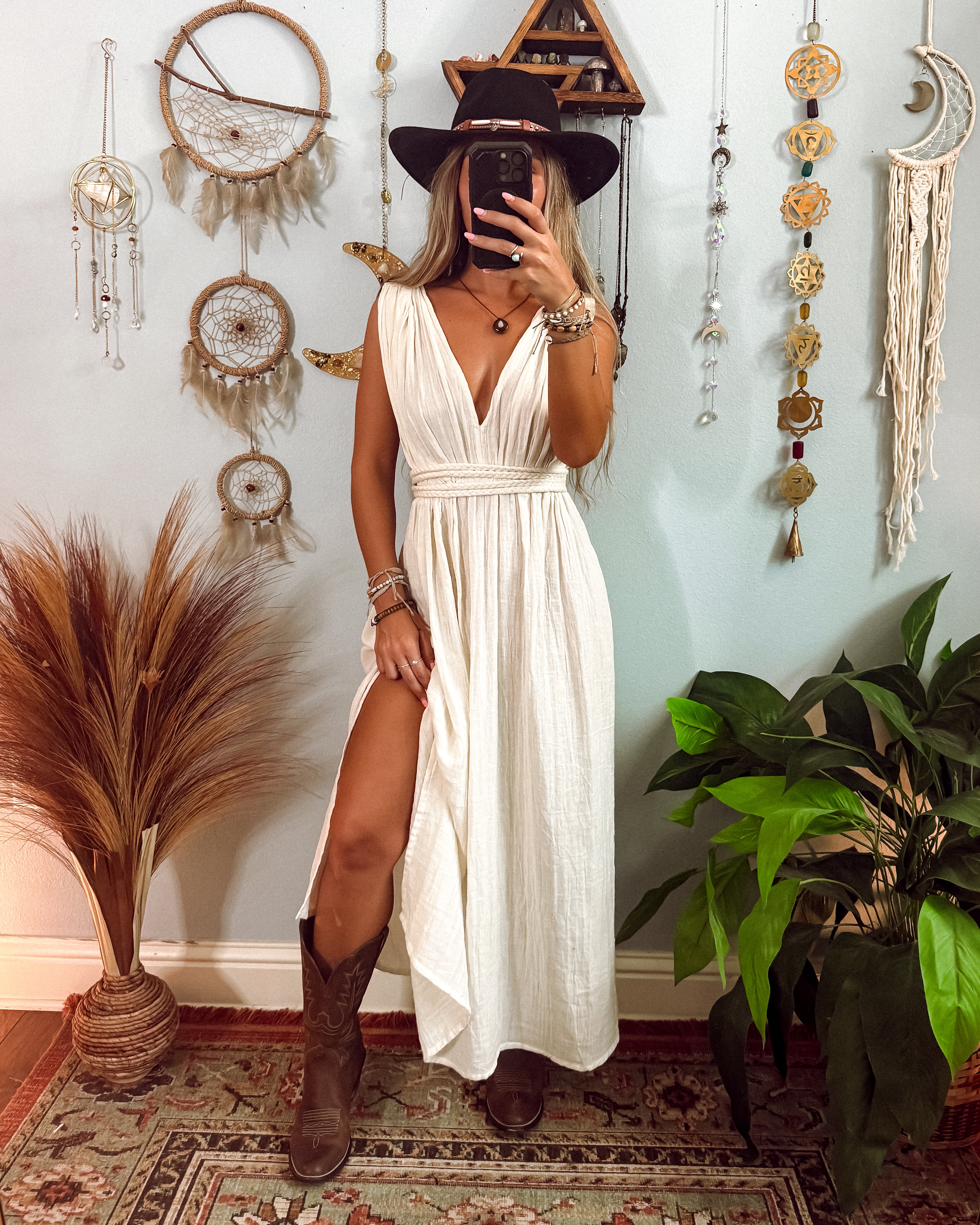✺The Clara Dress offers versatile style with extra long braid detailing for multi-way wear and two leg slits for added movement. Its midi length adds a touch of sophistication, creating a perfect balance of style and functionality. Make a statement at any occasion with this must-have dress. Style with cowboy boots, winter boots, sandals or go shoeless depending on your setting!