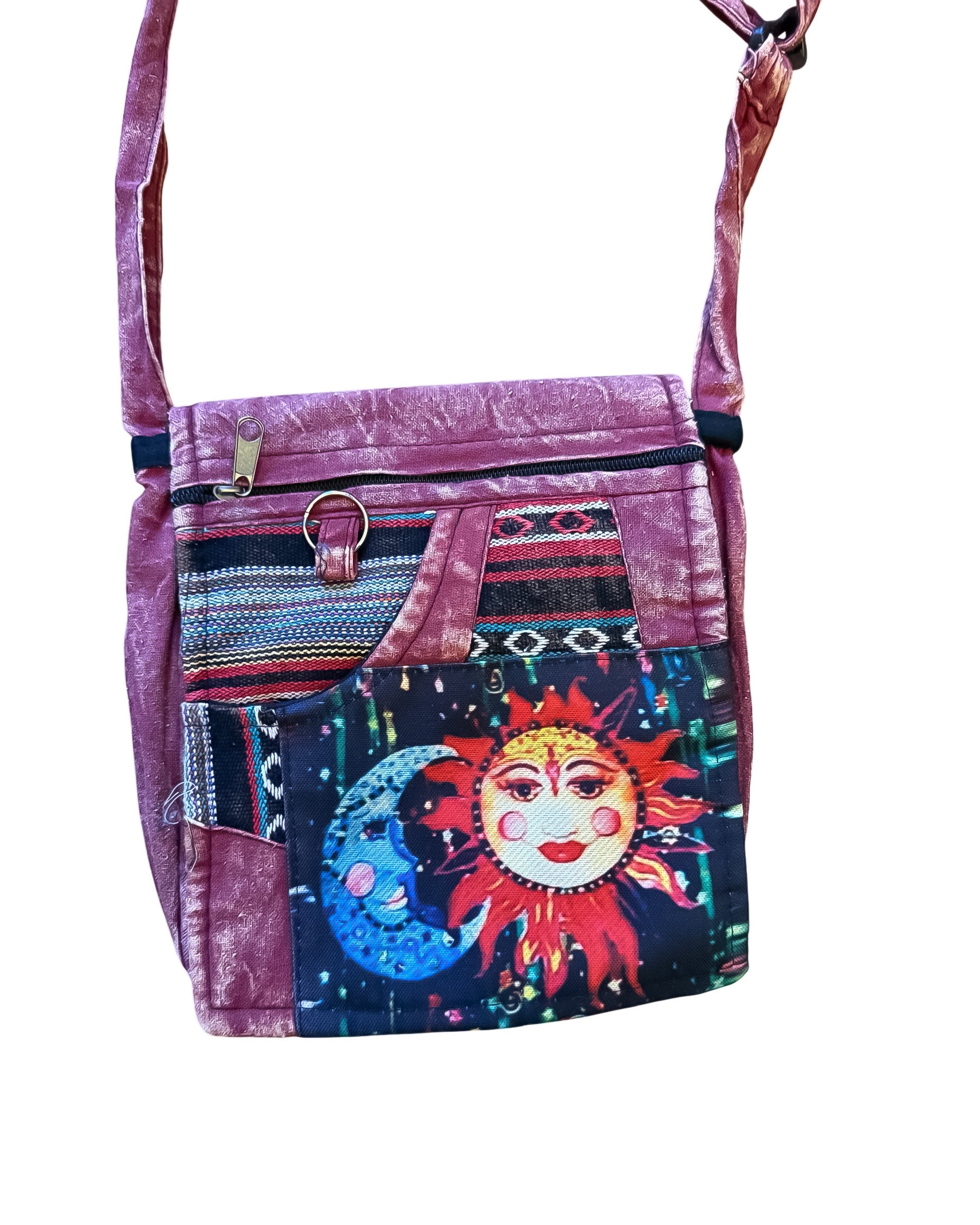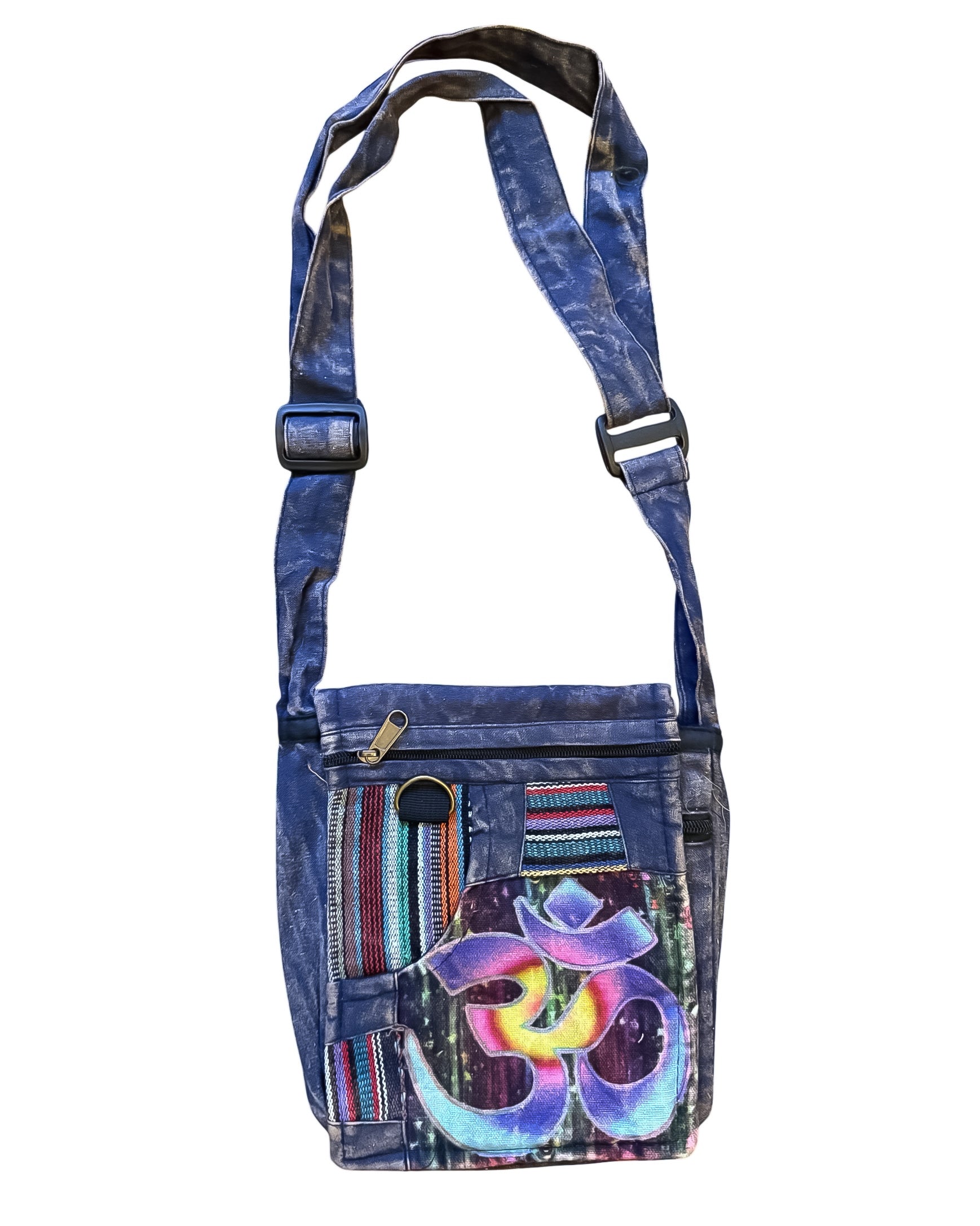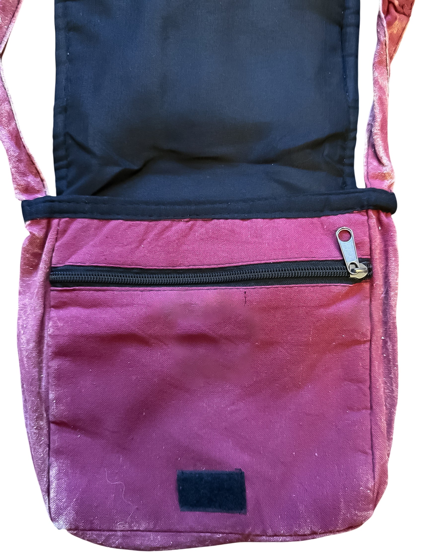 The PEACEFUL BAG is a functional crossbody bag designed for convenience during travel or daily use. It features two zipper pockets, a pouch pocket, and a velcro main pocket for secure storage. This bag is ideal for individuals seeking a practical solution for carrying essentials while on the move.