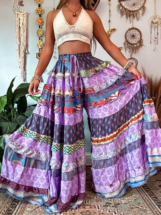 Introducing the newly designed and exclusive one of a kind Ordinary Selenophile LUNA TIERED PANTS. These pants are made from recycled sari fabrics & features two convenient pockets, a drawstring, and an elastic waistband that can be adjusted to fit a variety of sizes. Certain parts of the fabric may be see through in certain lighting depending on the opacity of the recycled pieces used. As these are made out of recycled materials, minor imperfections may occur.